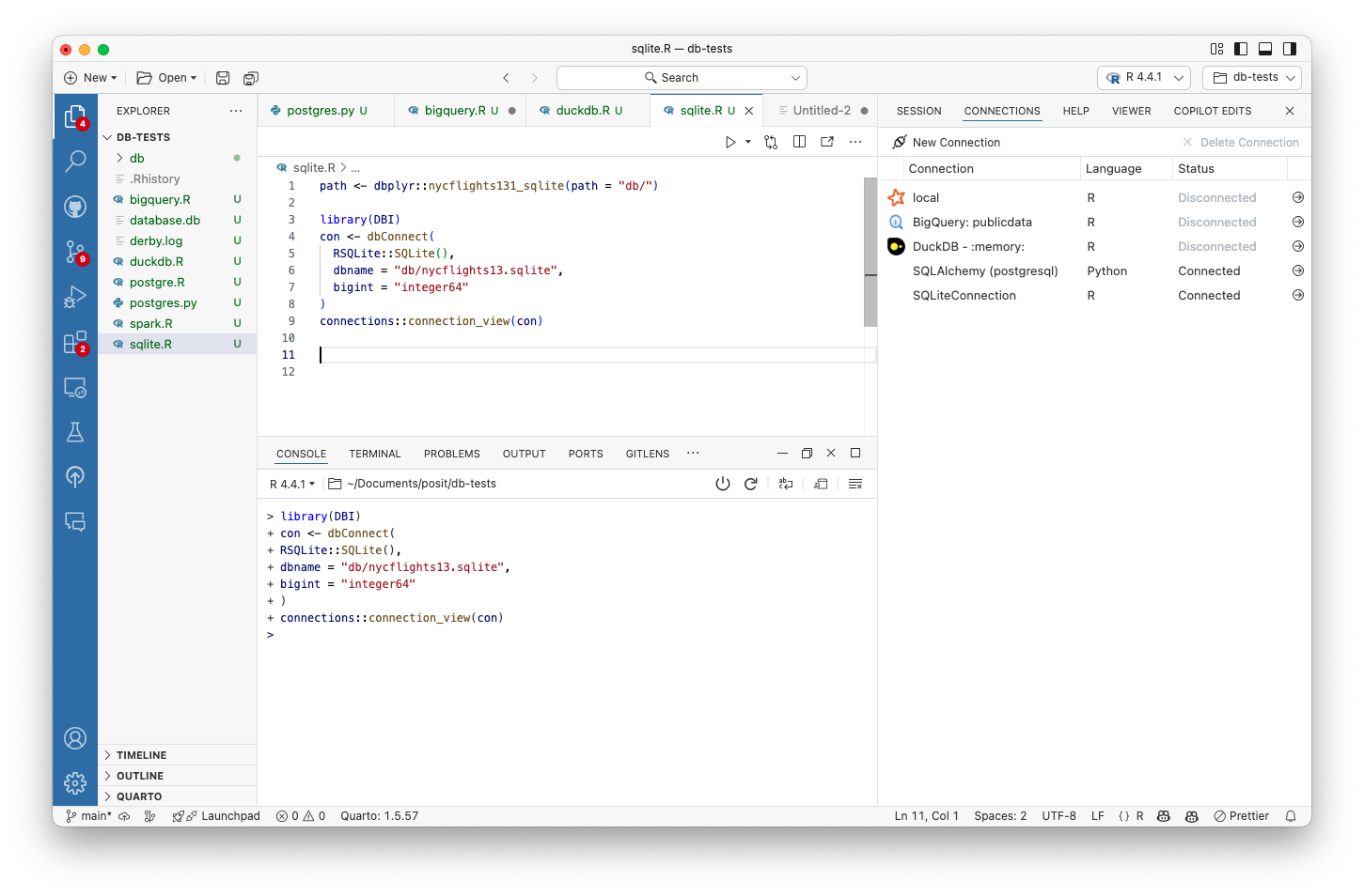The Connections Pane allows you to manage and explore database connections for use within your Python and/or R sessions. You can create connections to databases, explore their schemas, and interactively preview database tables.